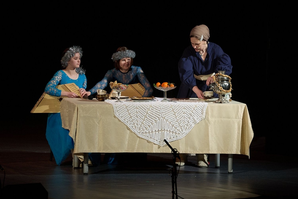 Проникновенно и тонко звучали со сцены рождественские стихи Иосифа Бродского от подруги хозяйки и ее соседки в исполнении Марии Фроловой и Марии Кузиной, выпускниц Воскресной школы при Богородице-Алексиевском монастыре и хозяйкиного племянника, которого сыграл выпускник Воскресной школы при храме святого благоверного князя Александра Невского - Владислав Воднев.